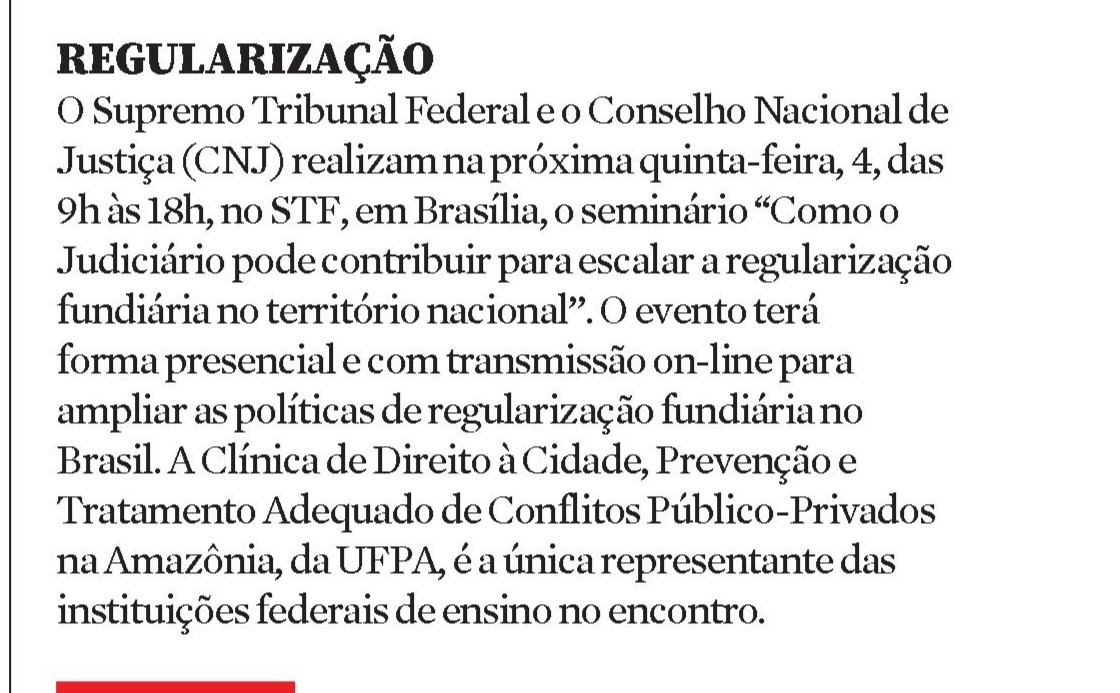 Jornal Diário do Pará - Edição do dia 02/12/2025 (pág. Nº02) - Coluna Repórter Diário: Destaca participação da Clínica MultiverCidades do PPGDDA/UFPA, no seminário promovido pelo STF e CNJ, em Brasília.
