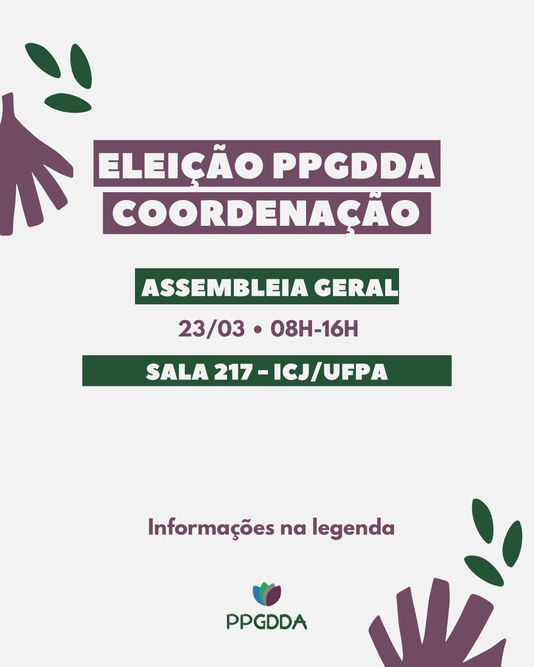 A assembleia tem como objetivo a eleição da coordenação e vice-coordenação do PPGDDA para a gestão de maio de 2026 a maio de 2028.