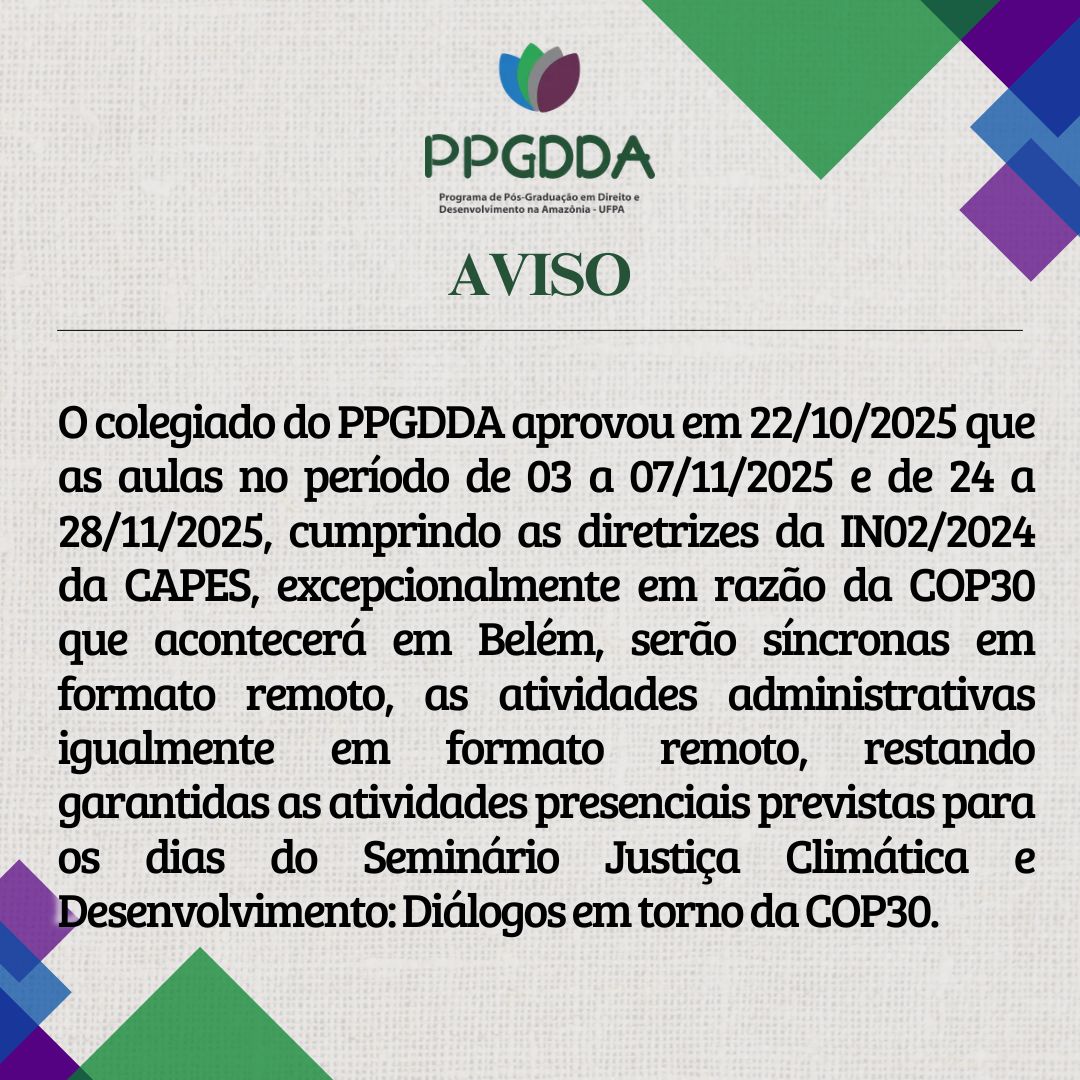 AVISO: Funcionamento das atividades no período da COP30 - PPGDDA