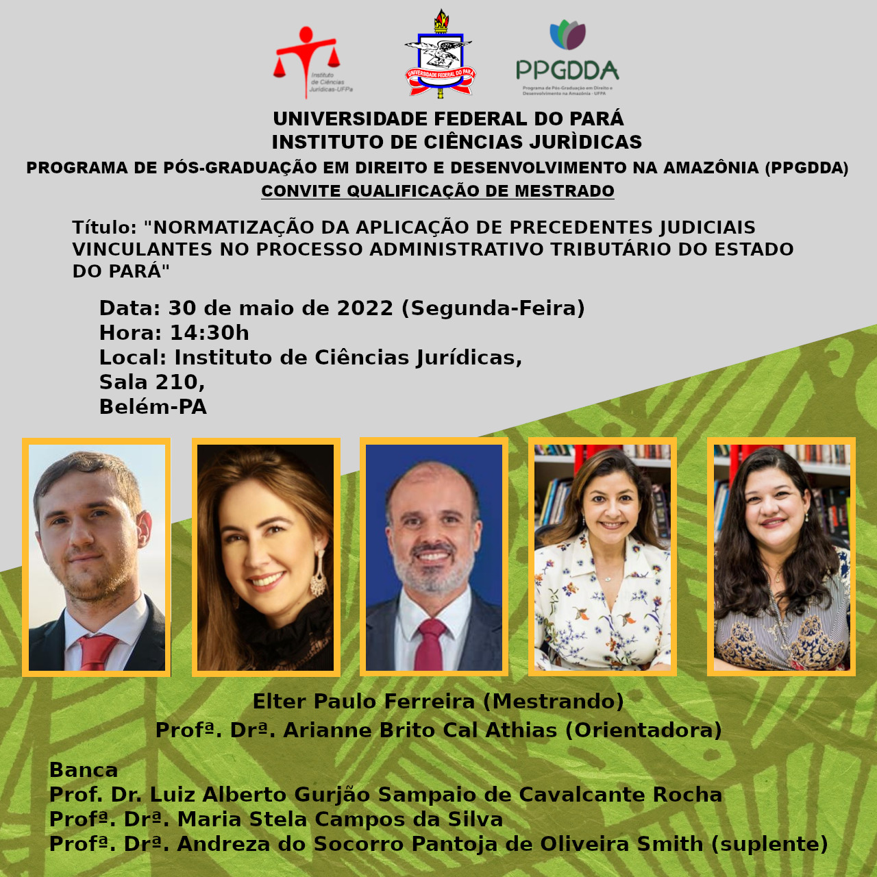 O PPGDDA convida para defesa pública de Qualificação de Mestrado Profissional em Direito da discente Tanha Charle Santa Rosa de Sousa, que será realizada no dia 24/06/2022, às 14h, nas dependências do PPGDDA. O título do trabalho é "ALIMENTAÇÃO ADEQUADA E SAUDÁVEL NO CAMPUS BELÉM DA UNIVERSIDADE FEDERAL DO PARÁ: ESTUDO DE CASO DAS AÇÕES E PROGRAMAS INSTITUCIONAIS VOLTADOS PARA ALUNOS E SERVIDORES"