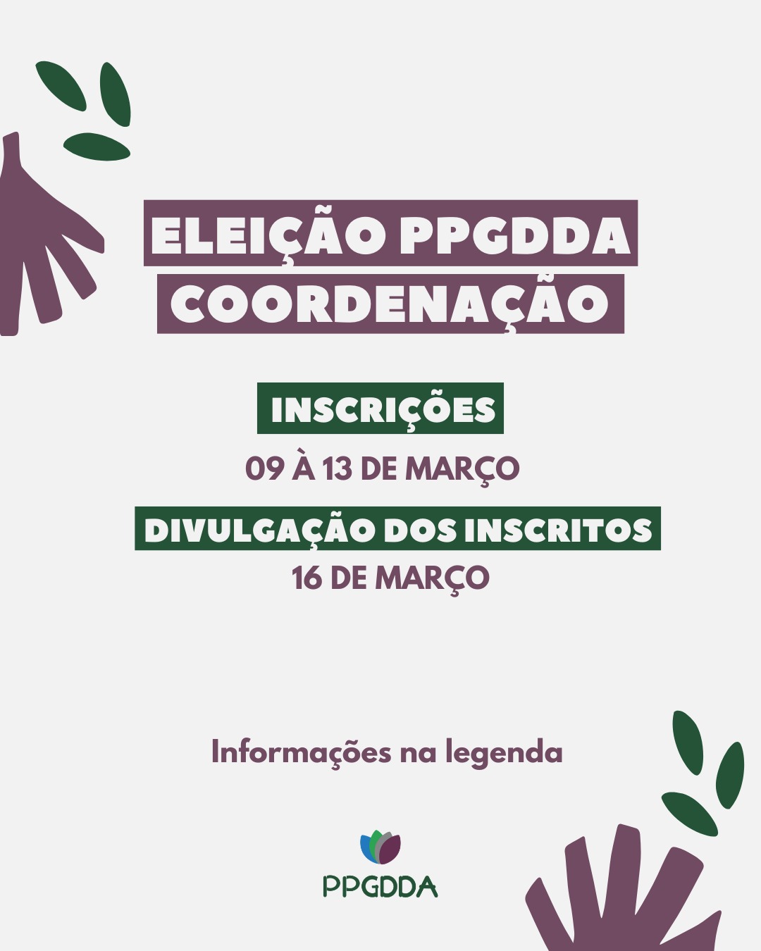 O Programa de Pós-Graduação em Direito e Desenvolvimento na Amazônia (PPGDDA/ICJ/UFPA) informa que está aberto o processo eleitoral para a escolha da Coordenação e Vice-Coordenação – Gestão Maio/2026 a Maio/2028.